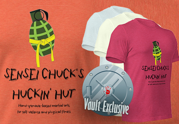 Practice the gentle art of hand-grenade based self-defense. Sensei Chuck honed his hand grenade-based martial arts through countless trials and emergency room visits. Put this shirt on and let everyone around you know that you studied at a dojo that has its own federal powerpoint presentation! Available only in the vault, because we can’t trust this kind of power to just anyone off of a random street in Florida, grab one today.