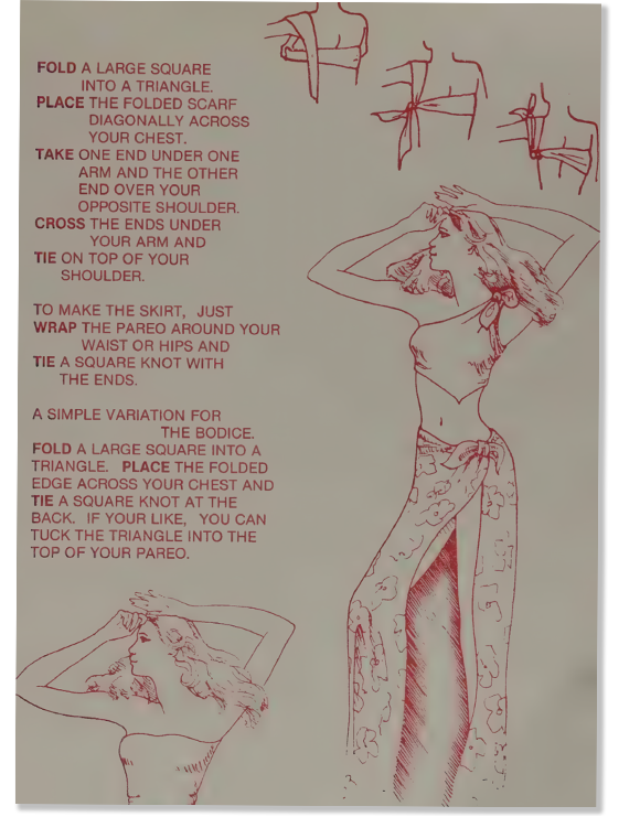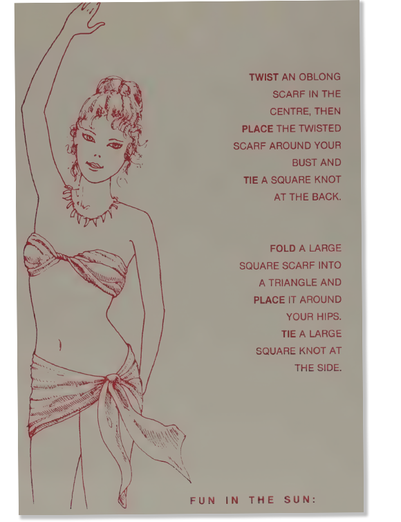 You wouldn’t believe the many fabulous ways you can have nothing but a scarf to cover your genitals if you are the size of a Victorian waif suffering from tuberculosis. Lorraine Hammett was bold enough to ask what CAN be done with scarves, not why the fuck would you want to do that? What if you were stranded on a desert island with only your suitcase full of scarves, huh? What then? Well, in just a few folds and knots, Lorraine Hammett would put together a fashion forward outfit and catch 200 fish.