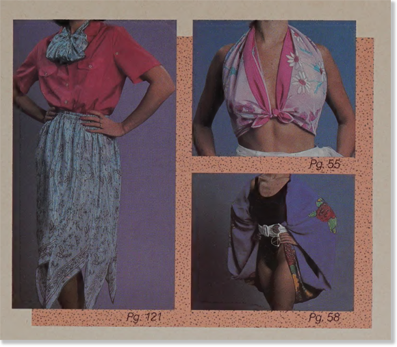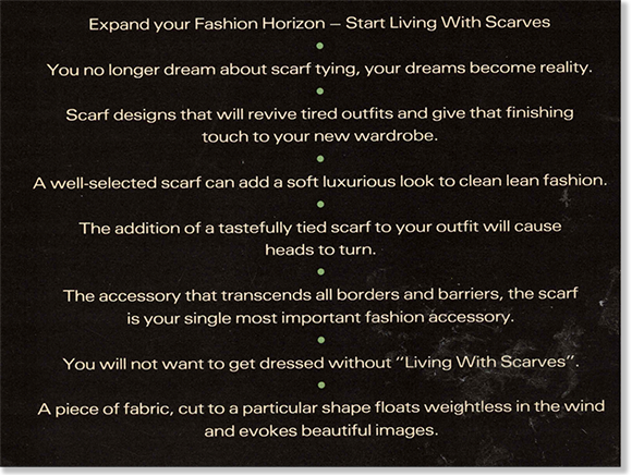 All of the scarf models in Living With Scarves have a similar sense of scarf ecstasy as the cover model. They all look like they’re staring into the distant future (1992), where we’ve achieved utopia through a complicated hierarchical system determined by scarf clips.
