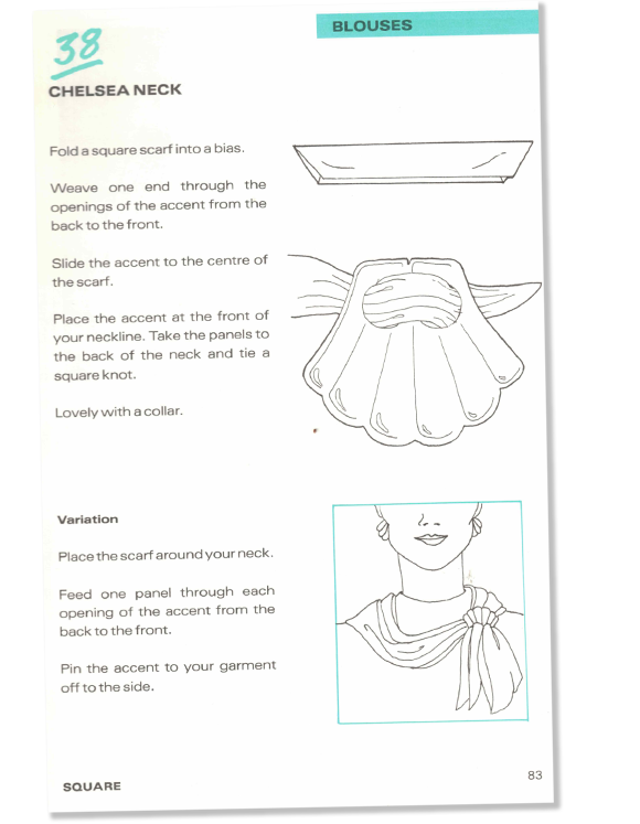 For some of us, the passion and intensity with which you can live with scarves might be a little overwhelming. The book is divided into different sections by type of shirt that absolutely must be accessorized with a scarf. I’ll admit I didn’t know there were seven different types of blouses alone that can be accessorized with scarves, and when you add in a scarf clip, accent, or beads, it’s a lot of information. Passing the Knaughty Ladies qualified scarf consultant test was probably harder than the bar exam. Quick, you’ve got a customer with a Chelsea neck blouse who wants to accessorize with a scarf AND beads. What do you do?