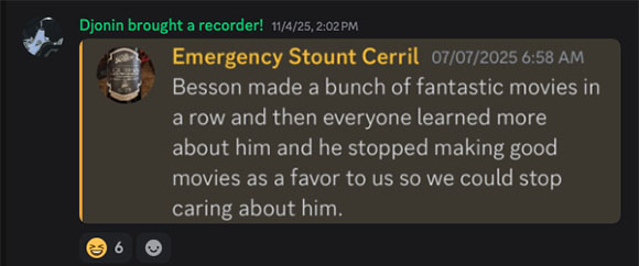 With our Deviant-in-Chief, Djonin, Cerril could spin jokes out of the vilest perversions. Like Luc Besson movies.