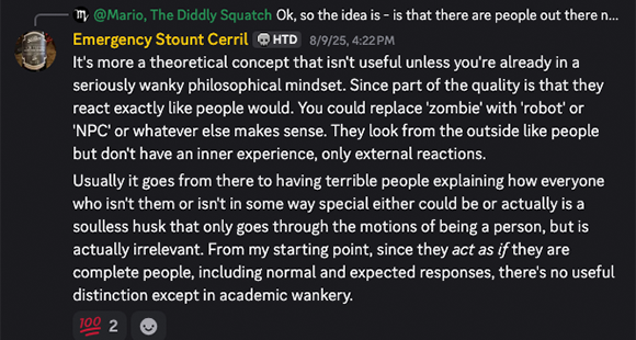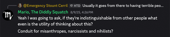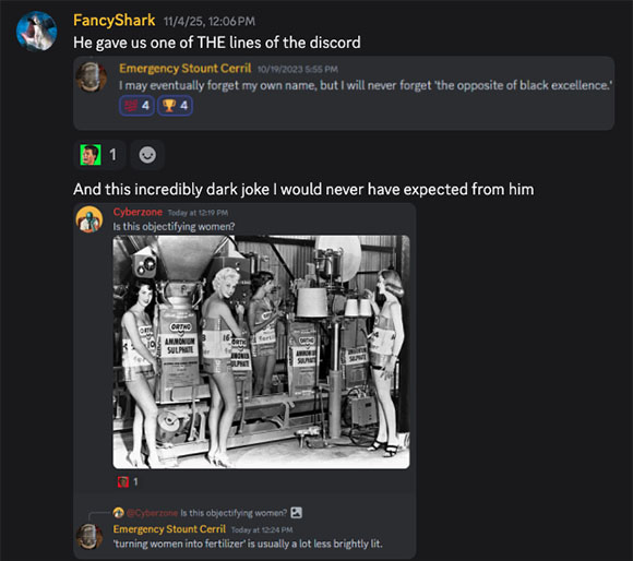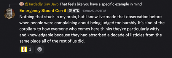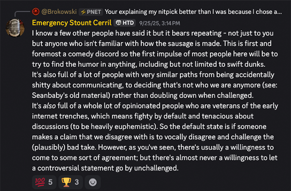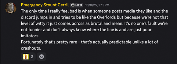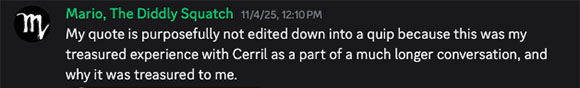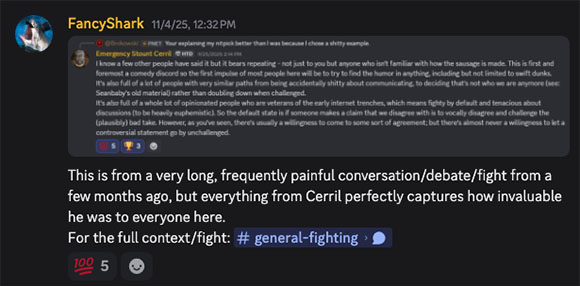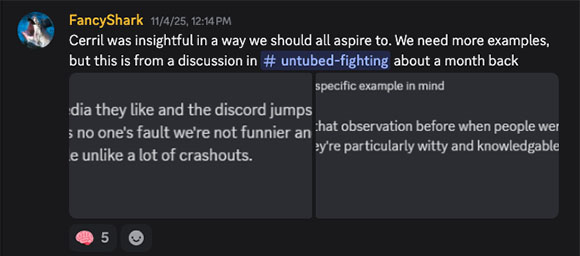 FancyShark remembers Cerril best for the times he voiced remarkable self-awareness and sympathized with people, when the rest of the Discord only wanted to dogpile. (To be perfectly fair, weāre really good at dogpiling. Nobody piles better, not even actual dogs.)