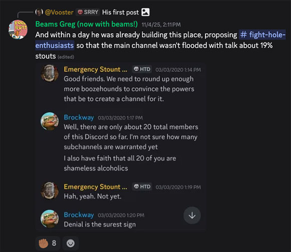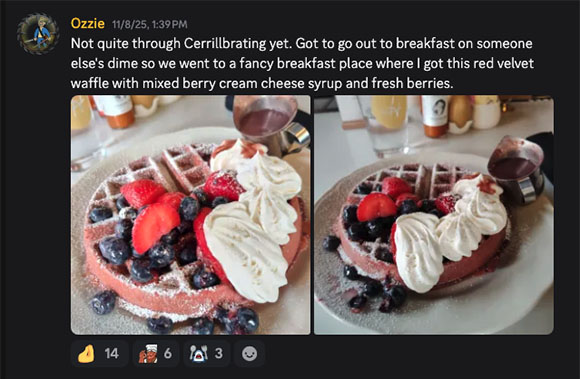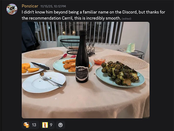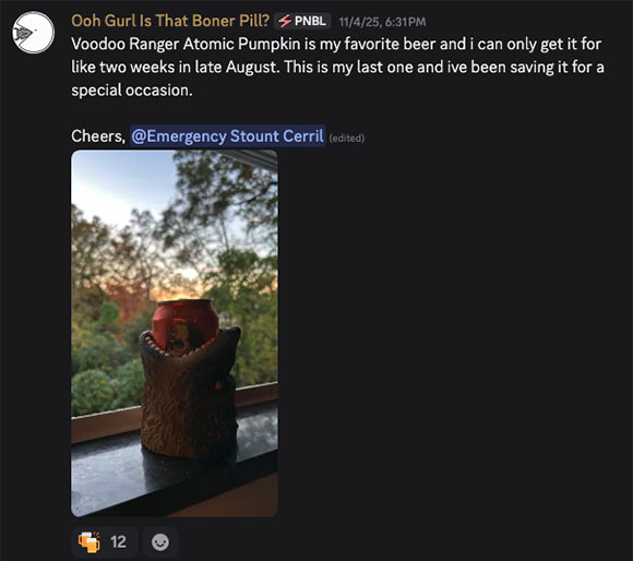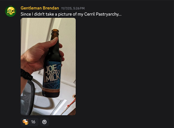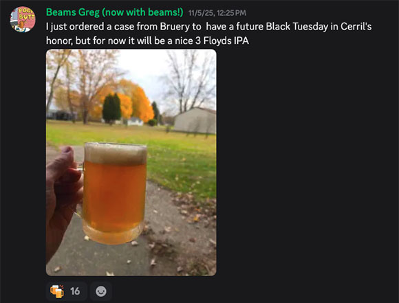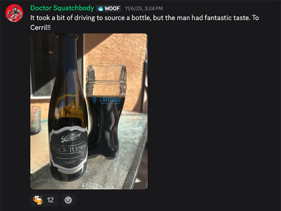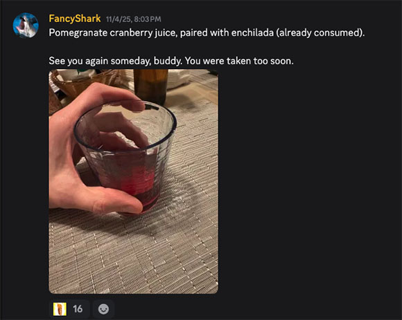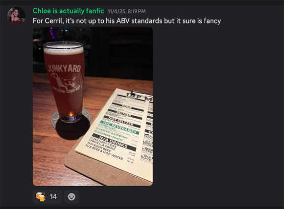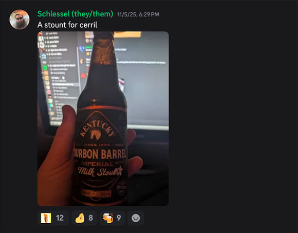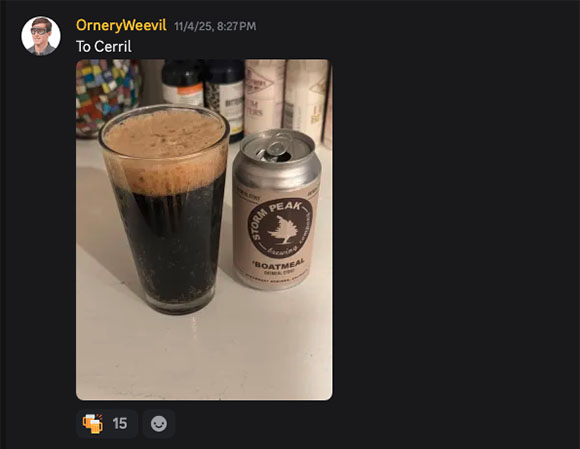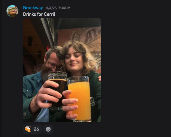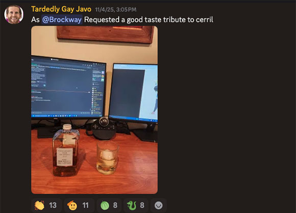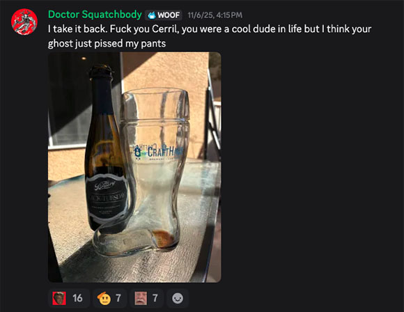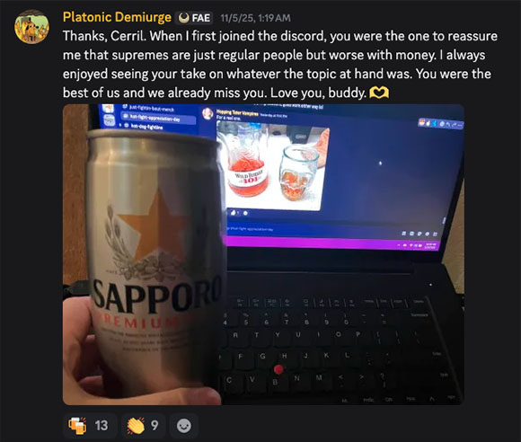 Itās not an exaggeration to say Cerril was the glue that held the Discord together in the early days. He was there on Day 1, among our very first Hot Dog Supremes. Always around to advocate peace with his incredible empathy. The reason we were able to build such a fun and thriving community without the tyranny of internet mods is because Cerril was there to cool down tense situations with grace and good humor, explain the other side of the argument to people crashing out of human language over cartoons, or just recommend someone a really good beer.