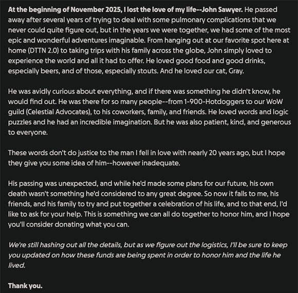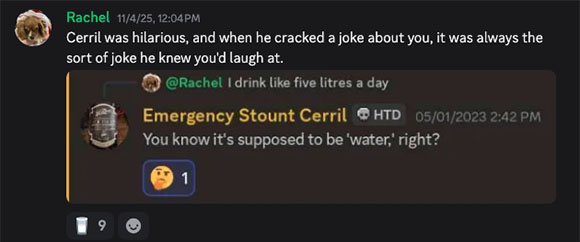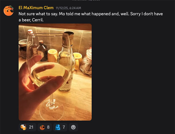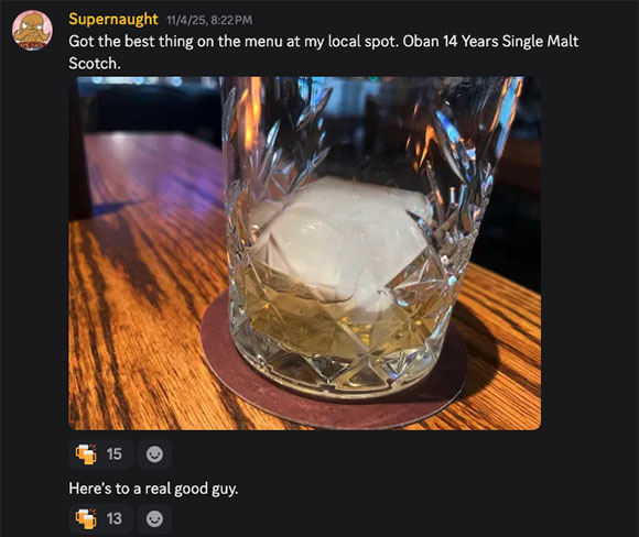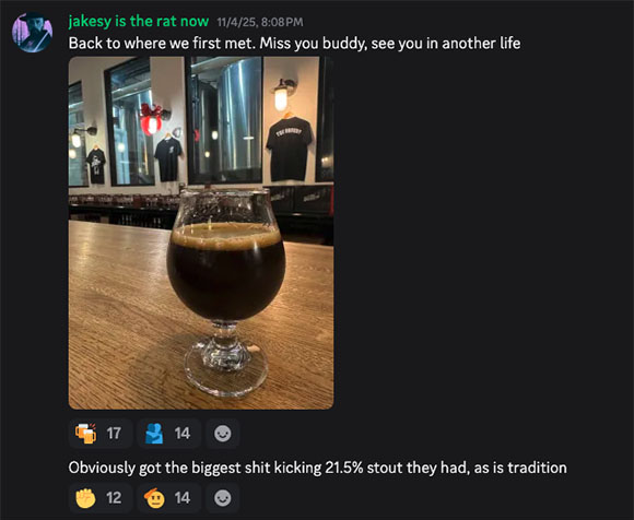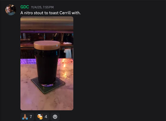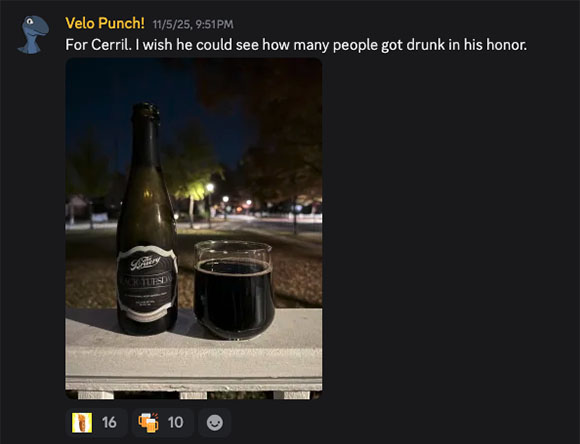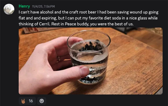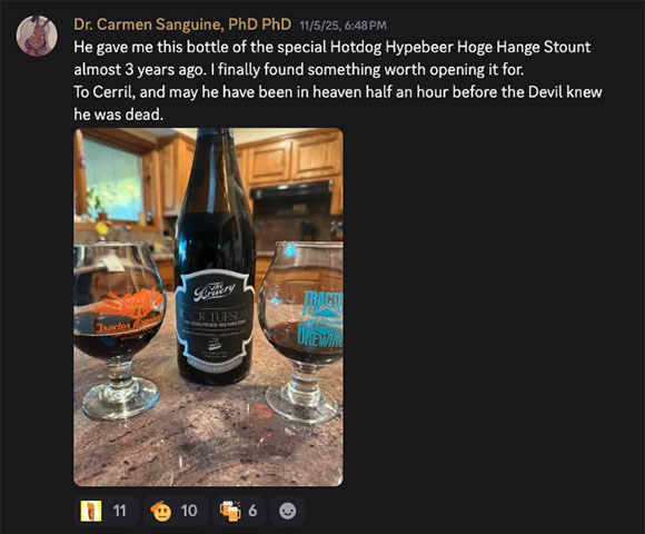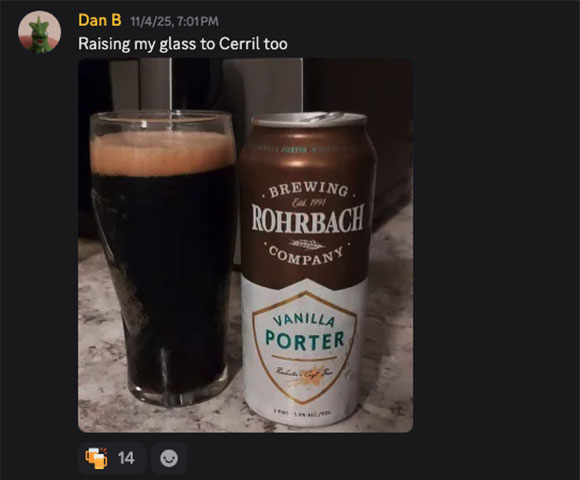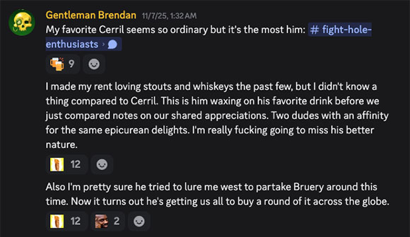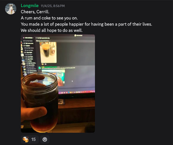 RIP, buddy. I donāt spend much time on the Discord because I tend to get overwhelmed by how active it is, and it sounds like I missed out on getting to know a really great guy because of it. I shall raise a glass in your honor tonight, Cerril.
