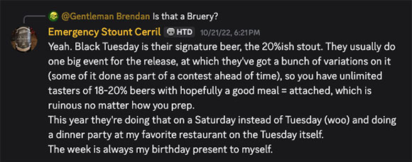 Then Brendan came in to find us all having drinks for Cerril and still standing afterward. He knew that was wrong, so he reminded us Cerril did have a favorite beer: Black Tuesday. A 20% alcohol stout thatās technically classified as a type of flail or morningstar in most states.