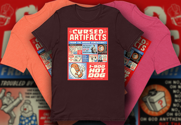 This week I think it is time to remind everyone about our catalog of cursed artifacts from the wrong dimension. Specifically that we have it available on a neat comfy shirt. Just in time for you to wear to Thanksgiving! Order now!*
