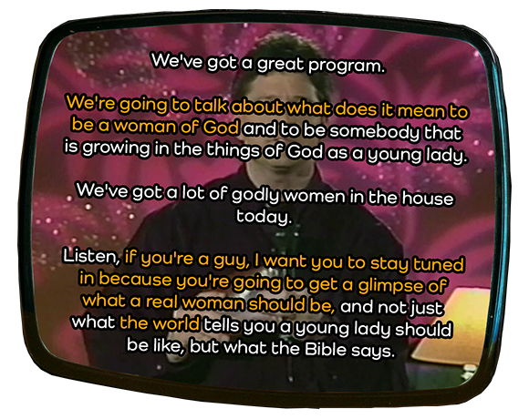 Nice nod at the secondary audience. ā€œNoā€ draws godly men like unburned books. Ron promises to teach boys how to ā€œtreat a lady,ā€ showing a relatable attention span. Despite the title, today’s only requirement is negative self-esteem.