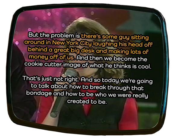 Technically, there’s still three minutes of Ron Luce hawking books after this. Along with one-way flights to undisclosed locations. But this semipoem captures the project. Random swings at capturing the emotions of teenagers, women, and humans. Evangelicals haven’t improved since.