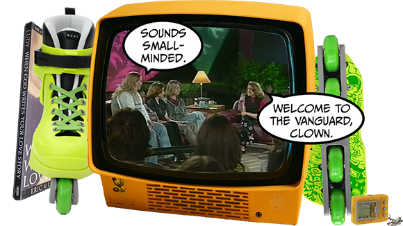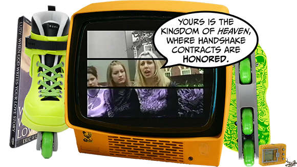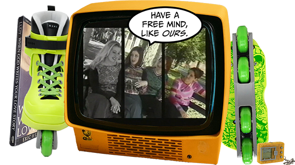 Meet the Unspiced Girls. Better known as The Darins, 1999’s most diverse gospel rockers. They live in a rotating three-way splitscreen that my attention span’s finally ready for. I don’t know how pre-fall teens coped with frames playing musical chairs. But I’m free from the scrolling urge for the first time in five years. A miracle.