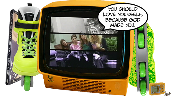 If there’s a title-relevant point, it’s here. Katie sits real teens down to get real about body image issues and their real cure Jesus. I’m told no one reads extended quotes, so I’ll paraphrase.