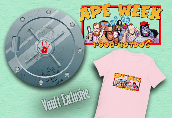 If you are looking for a mate and you can’t find a man, you can find yourself an Ape Week shirt, available this week in the vault! Be the queen of the jungle, be the mistress of the apes, wear your shirt proud, make everyone congregate.