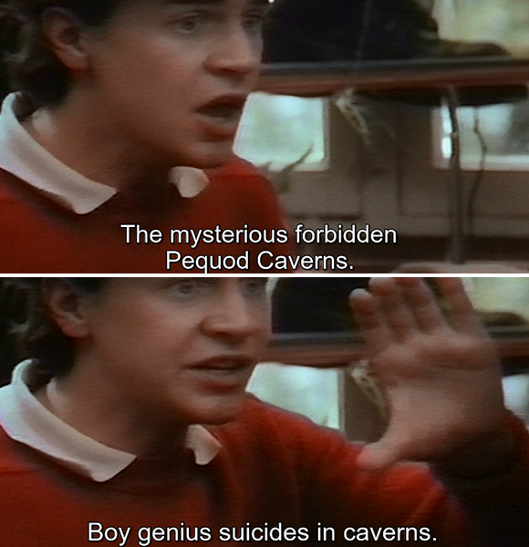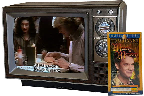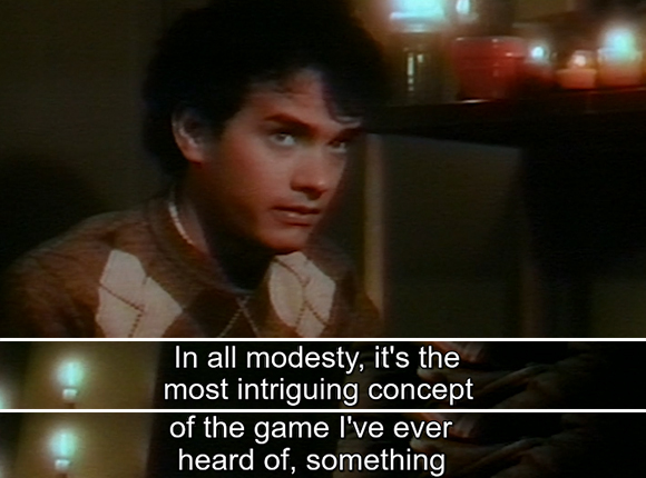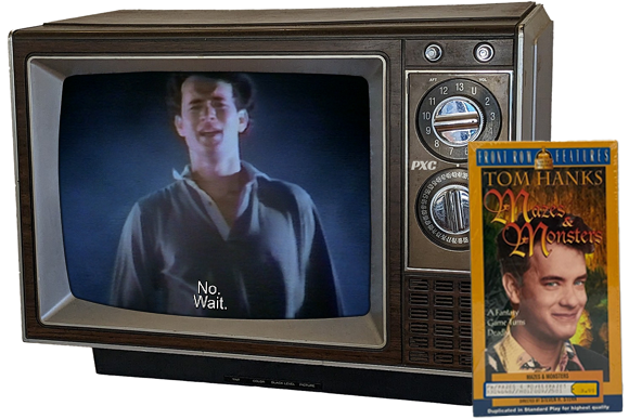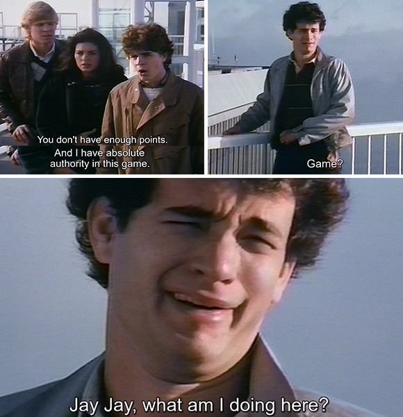 Hanks, already reflexively protecting his image as a âHollywood Nice Guy,â not only defends Jay Jay verbally, but also opens up a glowing rift in his chest cavity and sucks all the mental illness from Brockway into himself as a grand sacrifice. This also transfers unto him the function and title of Main Character For The Rest Of The Movie. As Jay Jay pitches his plan to move their Mazes & Monsters game to Pequod Caverns (the suicide part now completely forgotten), the spectre of madness descends on MiRoHan like a coke fiend jonesing for a fix of the substance they habitually abuse – drugs, probably.