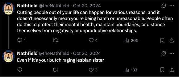 The Nathfield Twitter has a People’s Party Of Canada cover photo and tweets a lot about politics but in a far more radical way than Nathen Mazri does on his own profile. His profile has a lot of political interview clips of people he idolizes, like Tucker Carlson. Meanwhile, on the Nathfield account, he’s still taking out personal grievances, and not just Garfield-related grievances either. He had the orange cat that’s going to save our world from grease call his sister a “butch raging lesbian.” As far as I can tell, Nathfield’s butch raging lesbian sister is not a character in the cartoon.