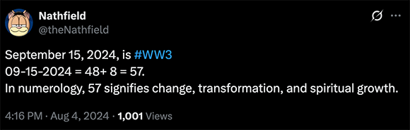 He also went through a phase in 2024 where he kept predicting the end of the world every few months using cat food-brained numerology, and never deleted his predictions when he was wrong. Nathen! You can delete things when you’re wrong, and no one will ever know it happened! Like when you jumped up and down in a CELIBACY IS SEXCY shirt. But he is right about one thing: 48 + 8 = 57.
