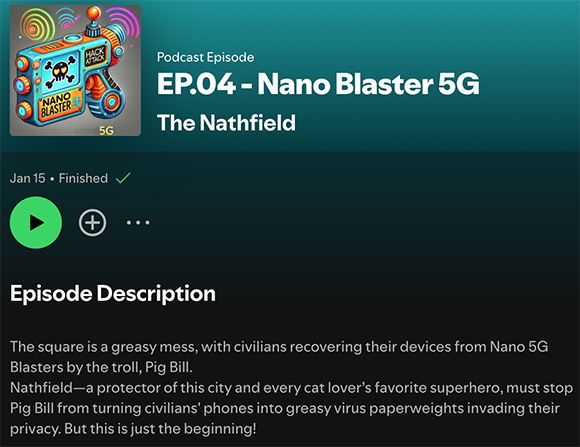 In episode four, Pig Bill and Nathfield finally meet and fight! This is huge for the Nathfield universe which has so far been mostly a commercial for another unsuccessful Nathen Mazri business, an app called egeez, and characters monologuing about how corrupt the world is. It’s the first real action in the Nathfield universe, and it attempts to explain what a grease storm is!