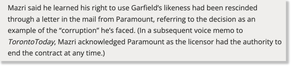 I know you’re probably thinking that this isn’t about Garfield and I’m being a silly little goose when I say it is, but it’s very explicitly about Garfield. He says it’s about Garfield. It’s been four years since he lost the license to sell Garfield merchandise and two years since he actually stopped selling Garfield merchandise…
