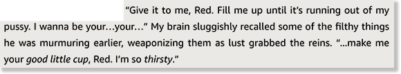 Going into this, I knew that making her his good little cup would come into play because I hate to tell you, there is merch for that. With the signed editions of the physical copy of this book, you can get an exclusive “Make Me Your Good Little Cup” sticker. It’s made by a real artist, too. Vera Valentine is super anti-AI, which I love for a lot of reasons. Imagine having an author explain this commission to you, artists. “Um, yeah, so the Kool-Aid Man wants to make her pussy a cup is the basic idea. You get it.”