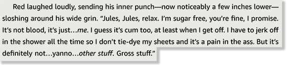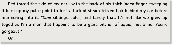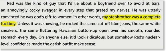 We open with Jules describing how her mother met her stepfather, Dan. Dan is a beverage distributor and, I believe, just a regular guy, not a beverage himself. Jules’ only complaint about Dan is that he fucks her Mom too loudly, but mostly her opinion is ew, but good for her, I guess. She doesn’t like her stepbrother, Red, very much, though. Let’s get a quick description of him.
