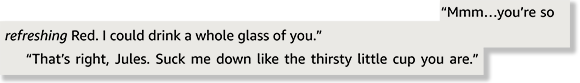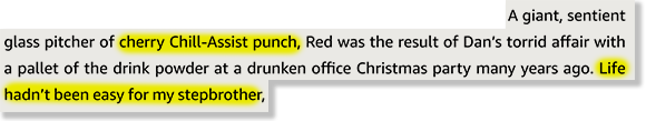 Her stepfather fucked an entire pallet of cherry Chill-Assist punch. I know I’ve been calling him the Kool-Aid man, but technically this book isn’t endorsed by Kool-Aid because, I guess, they hate opportunity? So, technically, Red is the Chill-Assist punch man. You probably have more questions about this origin story, I know I do, but at the moment, they are blowing right past it. I, for one, know, but if my stepbrother were a punch monster, I would absolutely have to know the graphic details of his origins. Does that count as an orgy with multiple packets of drink mix, or do they form a hive mind? Did he get a splinter from the pallet? Did the pallet gestate, and if so, for how many months? We’ll never know.