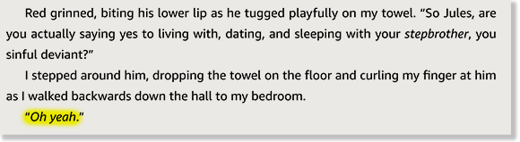 I sort of figured once the fucking began, she might lay off the Kool-Aid Man references a little, but that does not happen at all. The author does not want you to forget that Jules is fucking the Kool-Aid Man, or that she’s fucking her stepbrother. Jules often stops fucking her Kool-Aid Man stepbrother to think, “I can’t believe I’m fucking my stepbrother.” Which is by far the least unbelievable part of this sex!