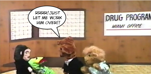 I know Randy Schmidt checked out of puppet morality plays long ago and is now abusing state drug-awareness grants to build a Puppywood sizzle reel, but this is getting awfully dark. I know you want to be the sock puppet Michael Mann, Randy, but this is a clear violation of rights. Itâs like having an out of control cop brutalize a restrained criminal, you canât-