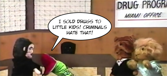 Sneaky Snakeâs lawyer wonât even charge for this one. You canât substitute an anti-drug rap for the Miranda Rights in any state except for maybe – oh right. Florida. Still, I donât care how hard it is to sew little puppet handcuffs, you canât just chain up a perp like a werewolf in any state but- you know what? This was, if anything, prophetic.