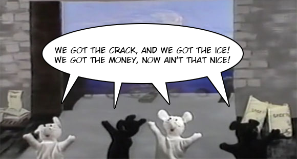 Thatâs all Mr. Crack needs to hear, heâs not sticking around to get gang-sang by a corrupt volunteer police force. He turns to flee, leaving his last drug rat behind.