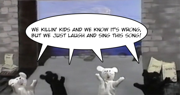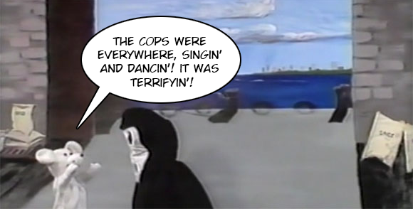 The way the rat describes it, singing and dancing in this universe are like beating the absolute shit out of somebody with a baton. So suddenly the part where Sneaky Snake asks about his rights and Sprocket and Bubbs just aggressively rap at him makes perfect sense.