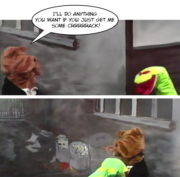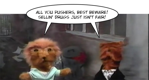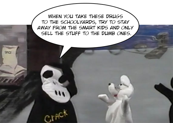 One thing all Randy Schmidt productions have in common: At some point they forget that their audience is made up of children who might one day be tempted by drugs, and instead begin directly addressing the junkies and peddlers who are presumably watching this sock puppet educational video through the gymnasium windows. If youâre the kind of soft-ass drug dealer who can be scared away from crime by a rapping puppet, this just saved your life. Those mollied-up grade schoolers were going to pet the flesh right off your body.
