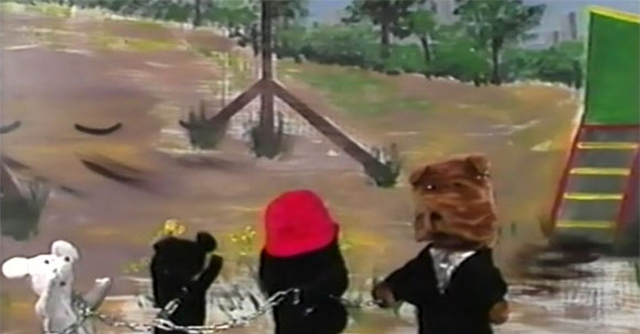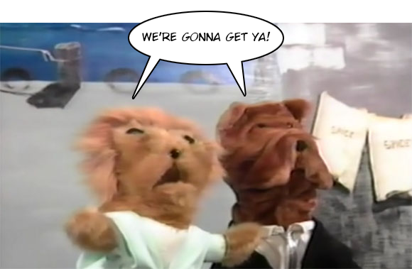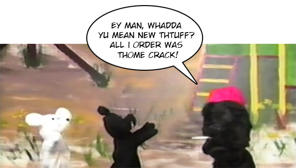 Thatâs Kit Kat. Like Cool Cat before him, heâs a problem and a confession all in one. Heâs upset because the rats showed up with this new drug, but he didnât check the Ecstasy box on his mail-in drug order catalog. Thatâs how drug deals work, as far as midwestern puppet producers know. The drug rats promise Kit Kat this new stuff will definitely kill some kids, which seems bad for business, but heâs all the way in. Thatâs all Sprocket and Bubbs need – they rush in to arrest everyone. Puppet cuffs still look like cockrings out of context, so Bubbs just chains them all up together. The optics are uh, not great.