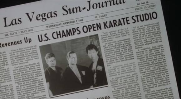 Tommy Lee, together with Alex Grady and Travis Brickley, have become BFFs and opened a dojo. We learn this when a newspaper appears on screen with the headline “U.S. Champs Open Karate Studio”. It’s followed by an entire page of temp text because Tommys’ brain forgot to visualize a completed article. The headline also calls them “champs”. In reality they are massive losers, but Tommy hasn’t accepted it.