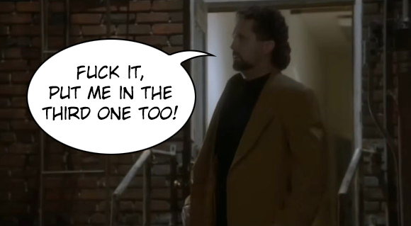 Later, Tommy and Alex are getting ready for a double date. Since Walter couldn’t break his brick, karate law dictates he still needs a babysitter. They dump him on Travis because they think he’s going bowling. At first Travis says no because in truth, he’s on his way to fight to the death against Vegas Shao Khan, but Walter begs and Travis immediately folds. He may not be racist anymore, but Travis is still a terrible human being who will absolutely bring a child to an event where, in a best possible case scenario, the child watches his babysitter murder someone. Travis bribes doorman Kane Hodder to let Walter in, which is sadly another indicator of Tommy’s failing mental state. Kane appeared in the first film as Burt, the jealous boyfriend who Travis tricked into punching his own girlfriend. Tommy is clearly recycling familiar faces to fill out his fantasy world.