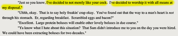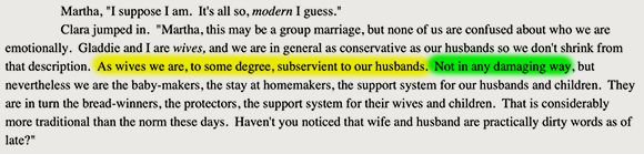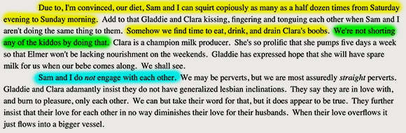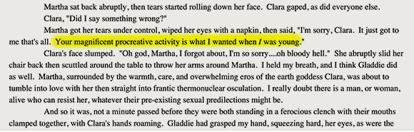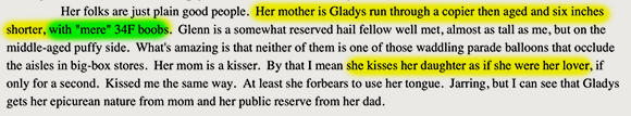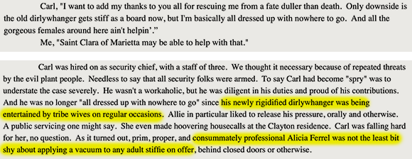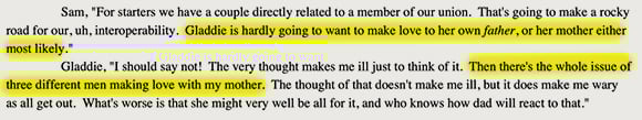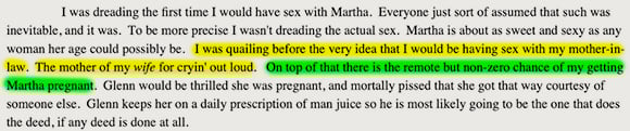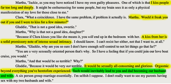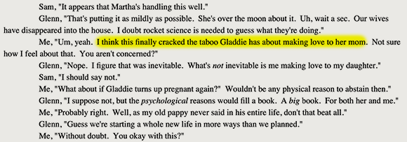 Characters overcoming trials is one of the cornerstones of fiction. Here, Gladys overcomes her resistance to having conjugal relations with her biological mother, while her biological father muses on the same with her. Should we recoil in disgust? Accuse Mitchell of unbelievable characterization? No. We should recognize that these characters are so so empowered by their rejection of the dictates of the criminal gangster FDA that they have become fully self-actualized, able to transcend the petty taboos progressivism imposes against fucking your parents.