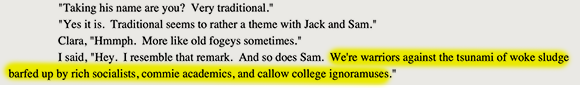 Is it “untraditional” for a man to analyze the cup size of his new wife’s mother? Is it “not conservative” for a woman to kiss her elderly mother on the lips? Mitchell ironically juxtaposes these scenarios with his characters’ disgust towards degenerate, craven wokeness. But they live in a world ruled by the socialist agenda, which at some point in the past made multiple marriage legal.
