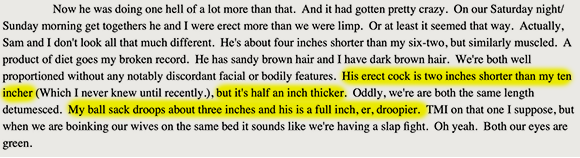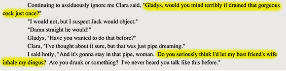 Less than an hour later, Jack is achieving simultaneous (heterosexual) climax with his best friend. How to explain this apparent reversal? Stranger things have happened in reality. Is it not unfair to expect fiction to follow staid, predictable character arcs? In day-to-day life, people make irrational decisions which run contrary to their stated beliefs all the time. And let it not be said that anyone in this erotic configuration is homosexual.