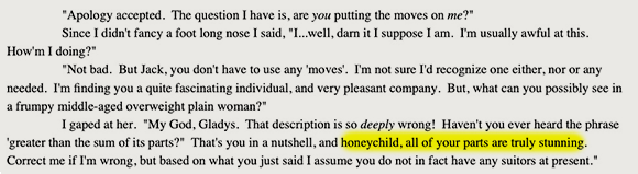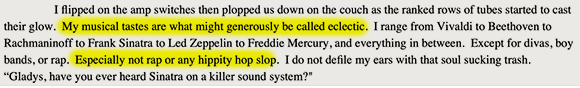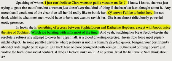 No divas, boy bands, or rap. Uncharitable readers might detect something of a commonality between two of those three genres, but recall that Jack is a conservative thinker. It’s modernity he despises, not any particular racial group. And while he’s certainly had detailed sexual thoughts about his best friend’s wife, he finds the notion that she might want to bed him quite surprising.