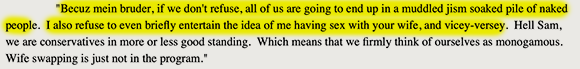 The two couples fall into a sort of double marriage. And while Jack may study the precise length and girth of Sam’s phallus, muse on the shape of his body, and plunge his own member into the depths of his wife only moments after his companion has reached climax inside of her, he is emphatically heterosexual.