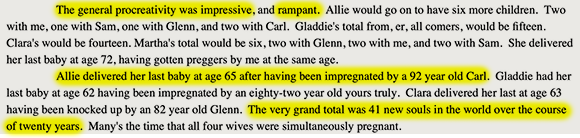 Our eight partially blood-related lovers spend their years, we are told, producing a bounteous wealth of offspring, including some which are no doubt the product of congress between Gladys and her father, or between Gladys and her father’s father.
