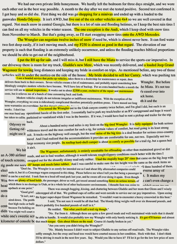 It is tempting to dismiss the great deal of Peachtree Carnivore given over to the discussion of cars and the customization thereof as a weakness of the work, a diversion from the core thrust of the text. In fact, the inclusion of this theme echoes that of carnivorous consumption and sexual licentiousness. For what is the car but a glorious extension of the body? And what is fuel but the meat of the car? Electric cars, it should go without saying, are equivalent to those Americans who consume plants — tools of the woke.