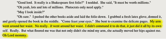 But what of the book? A Shakespeare first folio, which you may recognize as being doubly superlative — the rarest edition of a work by the most famous author in the English language. Note how Mitchell contrasts the high-brow context of the Bard with the bawdy actions of his characters, perhaps a commentary on the transformation of Shakespeare from ribald popular entertainment in his own time to dreaded, stuffy high school text in ours.