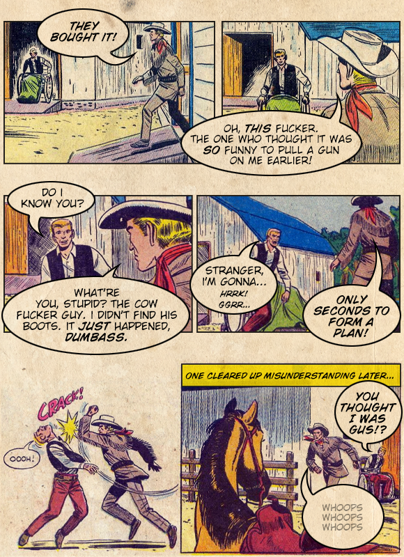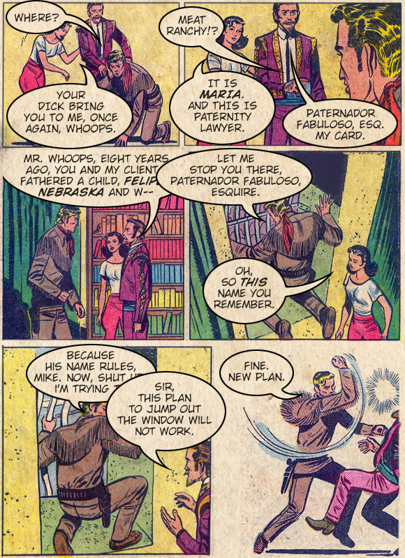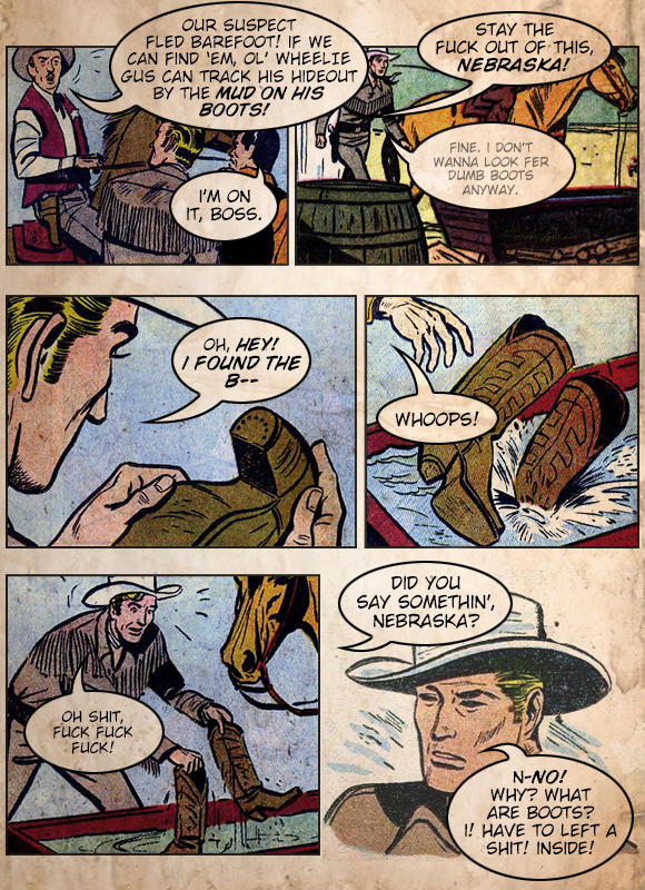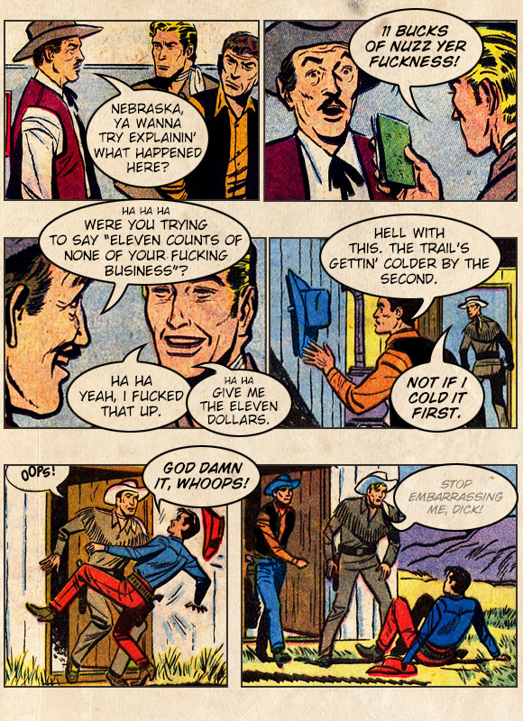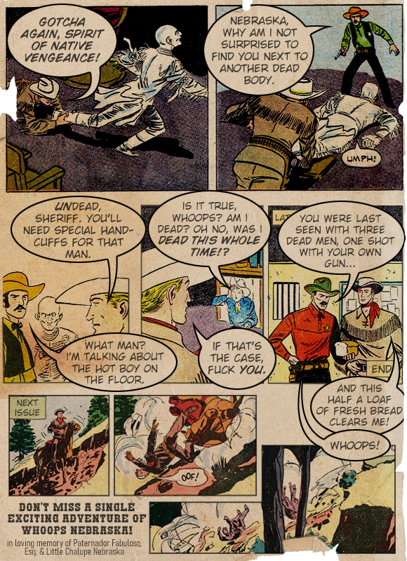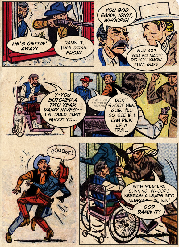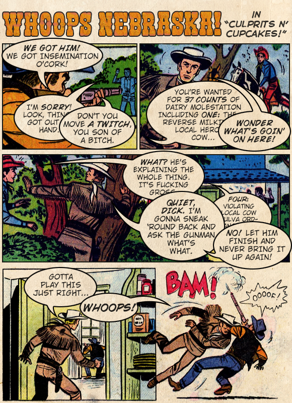 Men! Men! It’s time for comics! Comics about the gunslinging, fist-flinging fistslinger who never makes a mistake! Man Comics Presents: Whoops Nebraska!