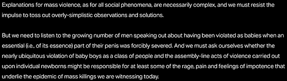 It turns out that Hess was kind of a harbinger of things to come, as the intactivist movement’s figureheads like Chapin realized in the mid-2010s that their biggest groundswell of support was coming from the alt right. Rather than stand their ground against them, they welcomed people who believe that circumcision is part of a pedophilic Jewish conspiracy and have struggled to control them while retaining their image as a respectable social movement ever since. Here’s Chapin arguing that circumcision is at least partly responsible for mass shootings.