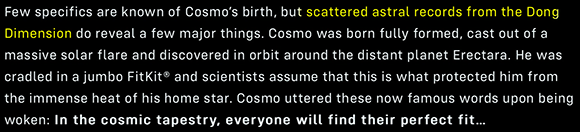 Foreskin Man’s powers included rocket boots, rich, and no third power. You might think Cosmo has some kind of condom projection ability based on the art above, a sort of prophylactic Kirby Krackle, but come on. That would be ridiculous. No, he’s actually immortal and omniscient, but only regarding penis length and breadth.