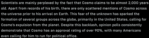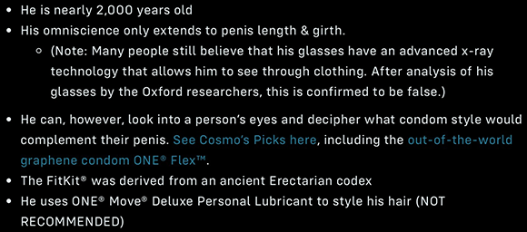 In the ONE Condom-verse, Cosmo showed up on Earth in 1999, terrified everyone with the power of infinite dildo juggling, and then spent two decades fruitlessly begging the leaders of earth to invent better condoms. I know this is all a silly promotional bit, but I want you to really visualize that for a second. A human-appearing alien arrives one day, demonstrating the powers of unassisted levitation and vibrator manifestation. He is completely indestructible and shows no signs of aggression. But he also refuses to share any information about the cosmos, his people, or the secrets of his incredible powers. When he meets with world leaders, he shakes their hands with a knowing look, leans in, and whispers “ribbed. Size small. Almond-flavored.” This little cock imp would be on the government operating table quicker than E.T. We will learn your terrible arts of condom divination, Cosmo! We will wrench them from your very star-flesh! The bloodthirsty, paranoid citizens of America demand it!