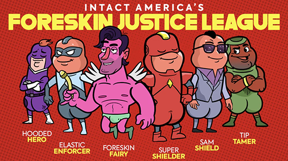 Cosmo’s meeting Intact America’s Foreskin Justice League, each of whom is an ambulatory penis except for the Foreskin Fairy, who’s just Angel from X-Men if he got on gear. Intact America is exactly what it sounds like β a well-funded, professional-looking organization advocating for an end to circumcision in the United States through unsettling imagery.